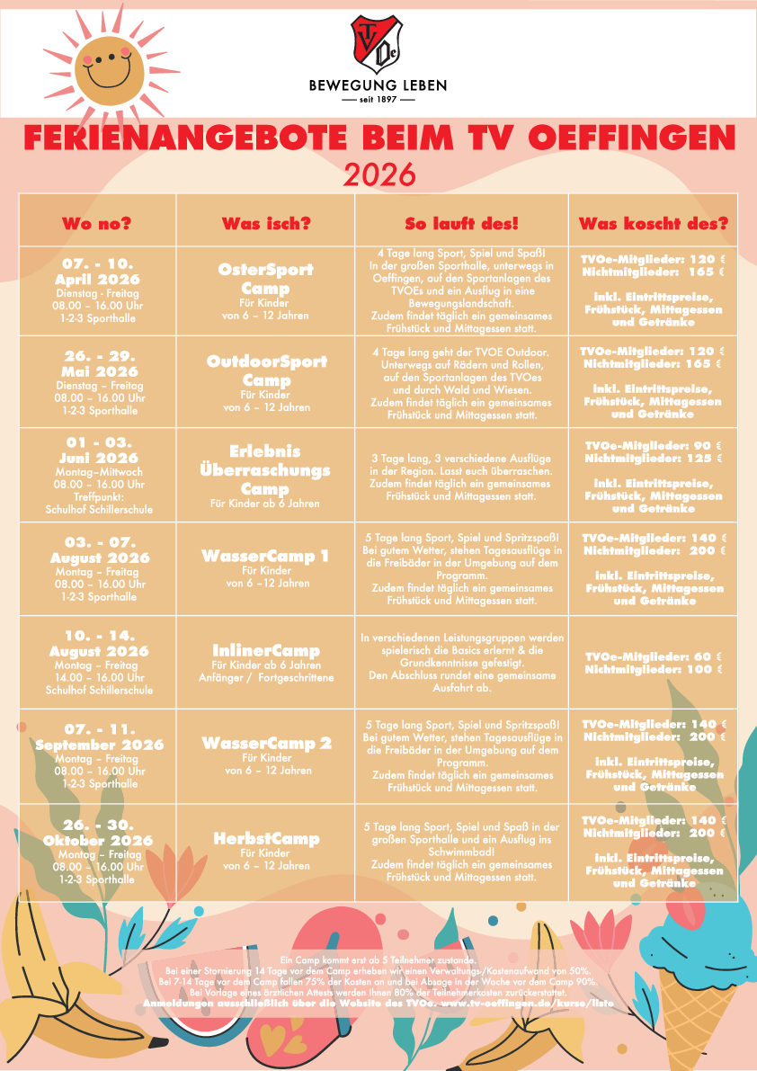 Weitere individuelle Infos für jedes Feriencamp erhalten Sie aus dem Programm und auf der Geschäftsstelle des TV-Oeffingen. Telefon: 0711-511707 oder E-Mail: dialog(@)tv-oeffingen.de